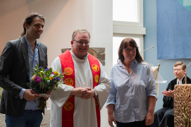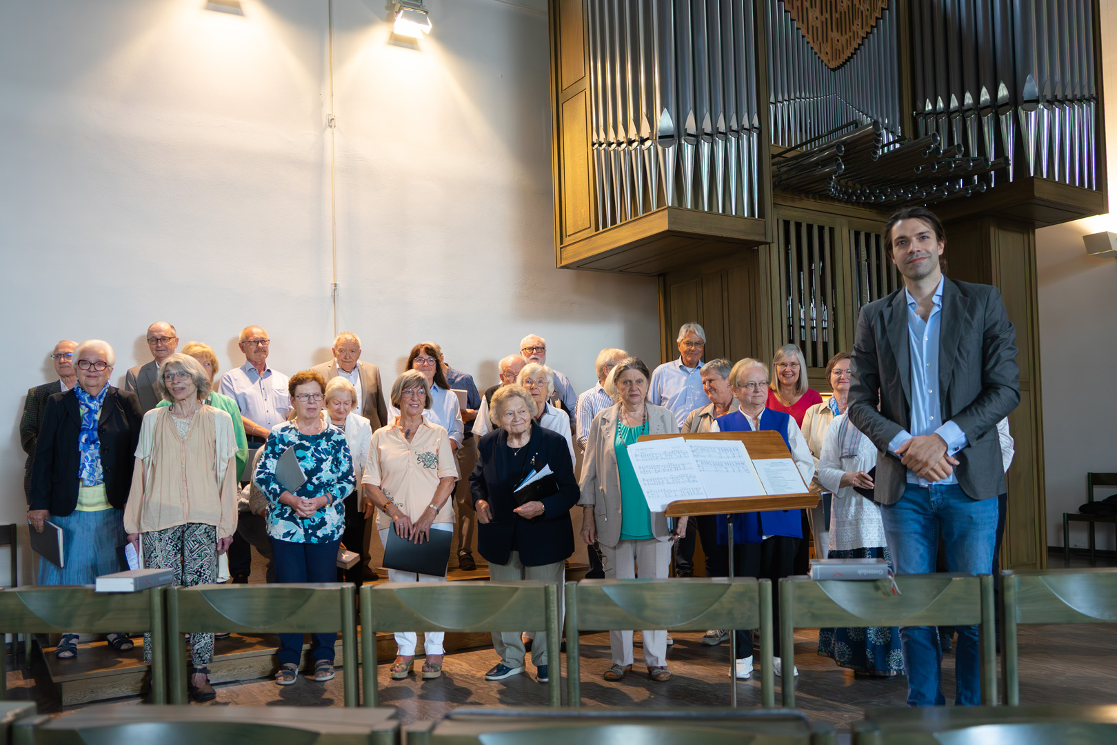 Musikalisch gestaltet wurde der Festgottesdienst von Michael Heinrich an der Orgel und vom Kirchenchor St. Laurentius-St. Lioba. Am Ende des Gottesdienstes galt es, den Dirigenten und Chorleiter Benedikt Al Daimi zu verabschieden. Dieser hatte den Kirchenchor seit Mai 2024 geleitet hat und tritt im September eine Stelle am Mainfrankentheater an. Gabriele Hornung, „eine Stimme aus dem Chor“ würdigte Al Daimi als einen „ganz besonderen Menschen“ und einen Chorleiter, der es mit seiner „einfühlsamen und wertschätzenden Art“ verstanden habe, Verbindung zwischen den Sängerinnen und Sänger herzustellen, „alle abzuholen, immer besser zu werden und sogar neue Mitglieder zu gewinnen“. Voller Wehmut dankte Gabi Hornung al Daimi „für sein leidenschaftliches Engagement, seinen Dienst an der christlichen Gemeinschaft und alle Inspiration“.