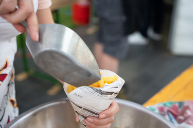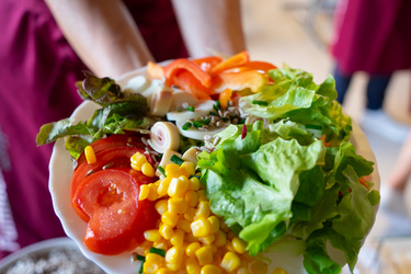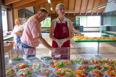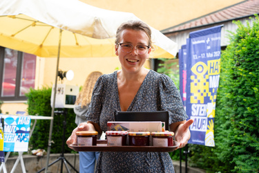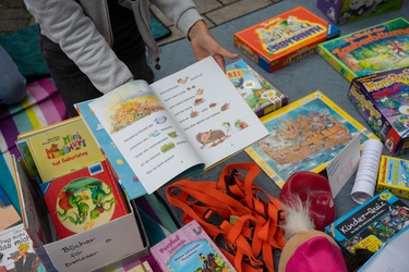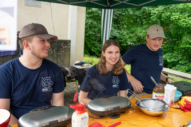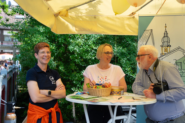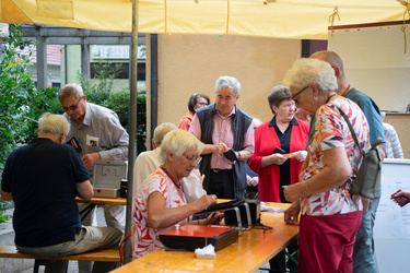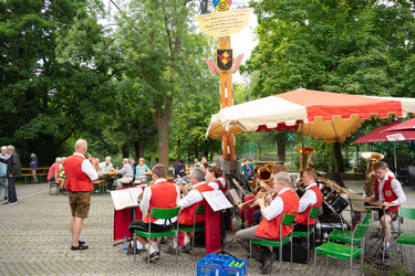 Den Auftakt des Festbetriebs im Hof und vor der Kürnachtalhalle machte die Blaskapelle Lengfeld; trotz heftigster Wolkengüsse spielten die Musikerinnen und Musiker eng unter einem Schirm zusammengekauert weiter und sorgten für beste Stimmung und treu verweilende Gäste. Sogar die vom Regen vertriebenen Anbieter und Kunden des Kinderflohmarkts kehrten tapfer zurück. Attraktiv für Kids und deren Eltern war auch das Kinderprogramm der Kindergärten, das Angebot des Familienstützpunkts und das Puppenstück „Kaspers Abenteuer mit den Waldtieren“ der Lengfelder Puppenbühne. Neben einem reichhaltigen gastronomischen Angebot mit Getränken, Grillgut und Pommes, bunten Salattellern vom Familienkreis, belegten Brötchen vom ehemaligen Frauenbund, frischen Waffeln von den Minis, alkoholfreien Cocktails von der Offenen Jugendarbeit JuZ und einem reichhaltigen Kuchenbuffet, gab es auch Informationen zum Pastoralen Raum, vom Verein „Partnerschaft Lengfeld – Pacoti“ und vom Lengfelder Bürgerverein. Bei einem Foto-Gewinnspiel rund um den Katholikentag gab es attraktive Preise zu gewinnen.