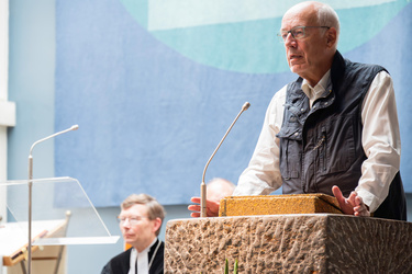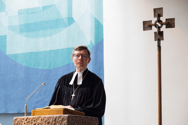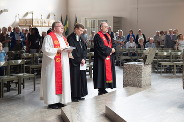 Der Ökumenische Festgottesdienst am Sonntagmorgen stand unter dem Motto „Pilger der Hoffnung“. Als Festprediger konnten die Veranstalter Dr. Wenrich Slenczka gewinnen, seit 1. Mai 2020 Dekan des Evangelisch-lutherischen Dekanats Würzburg. Im vollen Heilig-Kreuz-Chor des ÖZ ging Slenczka von einer Passage aus dem Hebräer-Brief (Heb 10,19-25) aus, in der der Verfasser zum Festhalten am Bekenntnis der Hoffnung aufruft. Slenczka sieht die Gefahr, dass die Menschen auch heute das Ziel aus den Augen verlieren, Ziel ist der Zugang zu Gott. Der Weg wird nach seiner Argumentation auf dreifache Weise geöffnet: Glaube, der frei macht. Hoffnung, also Festhalten an dem Bekenntnis und Loslassen aus der Angst. Und drittens Liebe – untereinander und füreinander. Diese ermögliche es, „gemeinsam Ökumene zu feiern, über die Grenzen unserer Religion hinaus“. Ökumenische Gottesdienste sind deshalb ideal, um Offenheit und Hoffnung zu leben. Sein abschließender Gedanke: Das Bekenntnis des Glaubens ist das Bekenntnis der Hoffnung, wie das auch in der ersten Fassung des „Credo Nicaeno-Constantinopolitanum“ formuliert wird. Daher griffen Veranstalter und Vorbereitungsteam für das Credo des Gottesdienstes auf die Ökumenische Fassung des „Credo Nicaeno-Constantinopolitanum“ zurück, in seiner ursprünglichen Formulierung aus dem Jahr 381. Im Jahr 2025 wird daran erinnert, dass dieses Credo rund 1.700 Jahre alt ist.