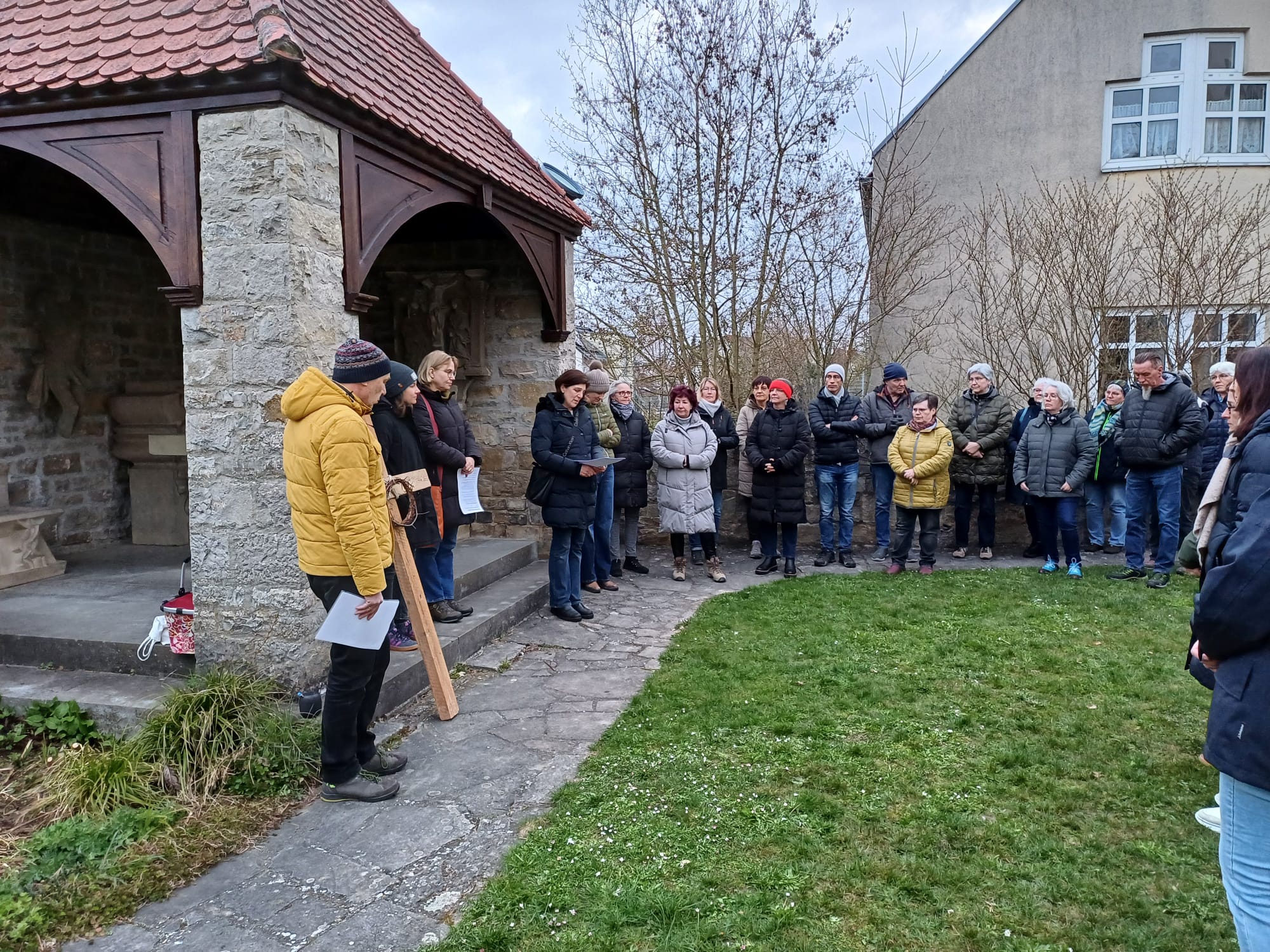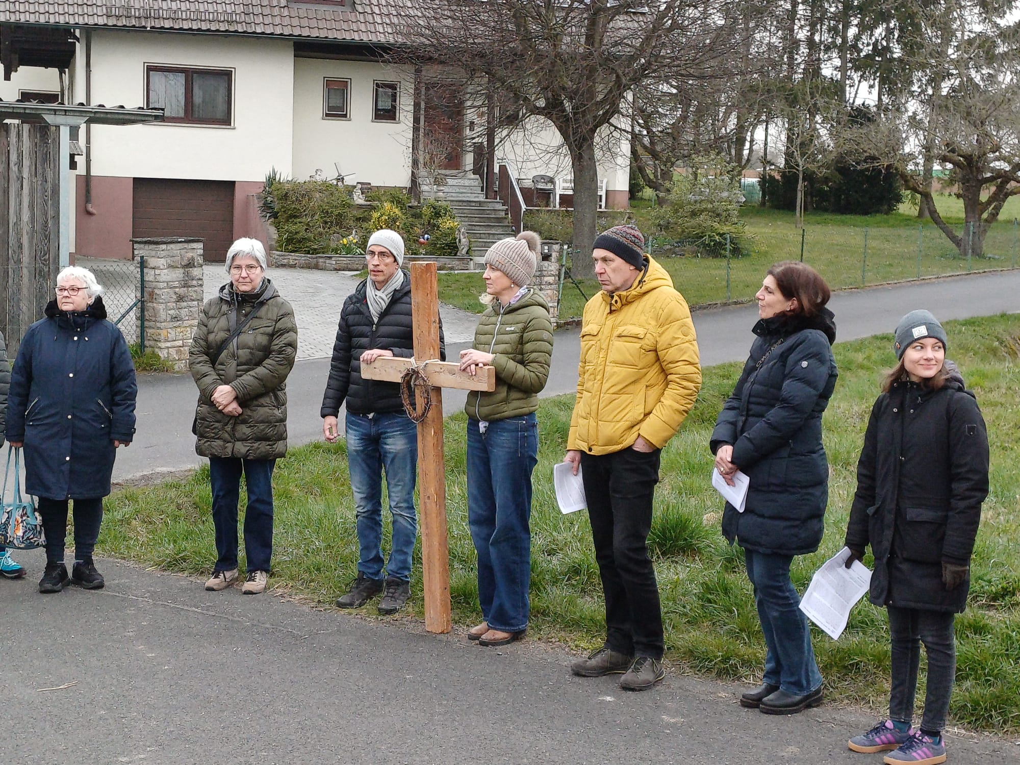 Treffpunkt war um 7.00 Uhr hinter der Pfarrkirche vor der Bücherei. Von dort aus führte der etwa einstündige Rundgang durch den Ort und seine Umgebung. An mehreren Stationen setzten sich die Teilnehmenden mit dem Kreuzweg Jesu auseinander und betrachteten dessen Leiden und Tod aus unterschiedlichen Perspektiven.