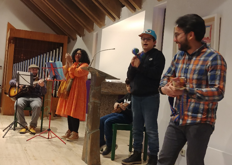 Janet Ardòn de Meyer (Gesang) hatte zwei weitere lateinamerikanische Musiker gewonnen und mit ihren rhythmischen, Liedern brachten sie uns nicht nur gedanklich in Bewegung, sondern ließen Funken von Freude und Dankbarkeit überspringen. „Gracias a la Vida“ konnten wir mit ihnen singen (mit einem Lied von Violeta Parra): „Danke an das Leben, denn es hat uns so viel geschenkt, Augen zum Sehen, Ohren zum Hören, Worte zum Kommunizieren und Entdecken, das Lachen und Weinen.“