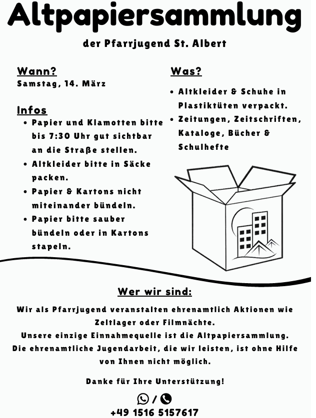 Wer wir sind: Wir als Pfarrjugend veranstalten ehrenamtlich Aktionen wie Zeltlager oder Filmnächte. Unsere einzige Einnahmequelle ist die Altpapiersammlung. Die ehrenamtliche Jugendarbeit, die wir leisten, ist ohne Hilfe von Ihnen nicht möglich