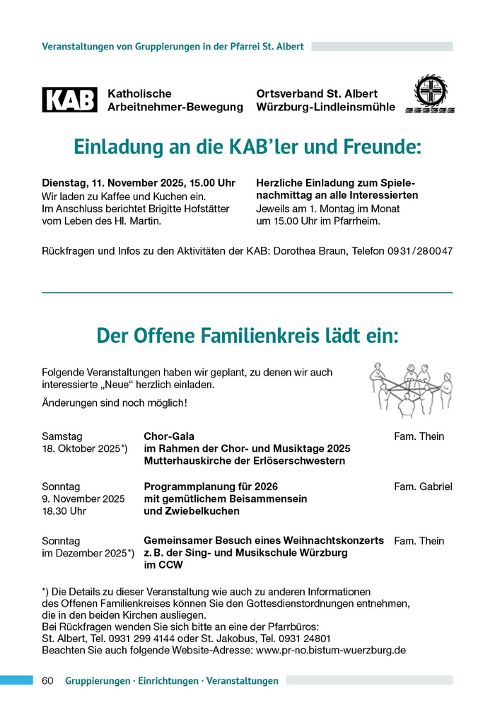 *) Die Details zu dieser Veranstaltung wie auch zu anderen Informationen des Offenen Familienkreises können Sie den Gottesdienstordnungen entnehmen, die in den beiden Kirchen ausliegen. Bei Rückfragen wenden Sie sich bitte an eine der Pfarrbüros: St. Albert, Tel. 0931 299 4144 oder St. Jakobus, Tel. 0931 24801 Beachten Sie auch folgende Website-Adresse: www.pr-no.bistum-wuerzburg.de
