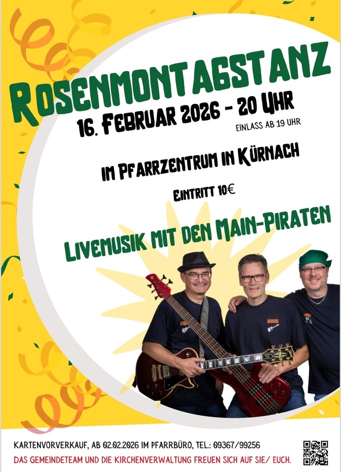 Der Kartenvorverkauf für den Rosenmontagstanz im Pfarrzentrum mit den „Main Piraten“ beginnt am Montag, den 02. Februar 2026