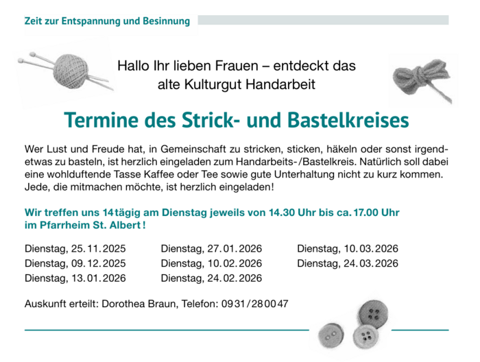 zu basteln, ist herzlich eingeladen zum Handarbeits- /Bastelkreis. Natürlich soll dabei